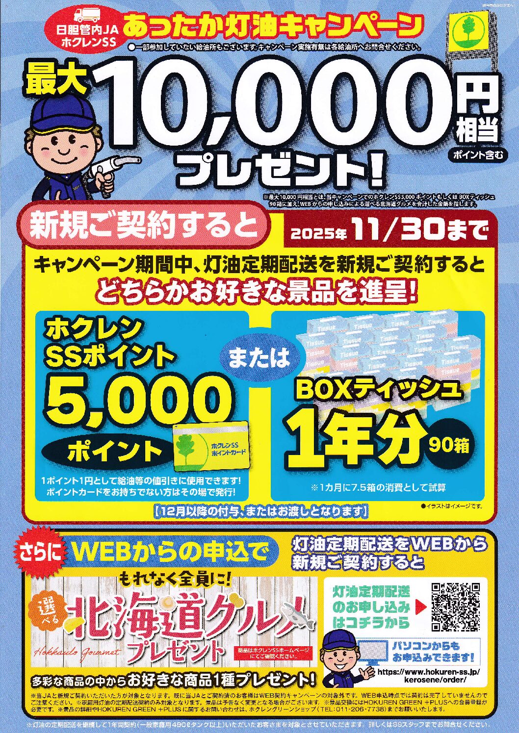 秋、冬にかけて定期灯油の配送を行っていますがキャンペーン期間中に定期灯油の新規ご契約すると