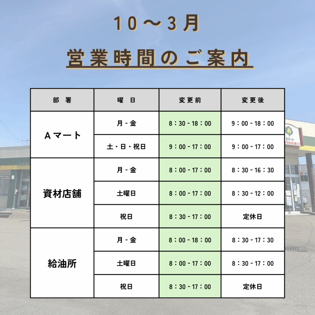 また、10月より Aマート・資材店舗・スタンドの営業時間が変更になります!