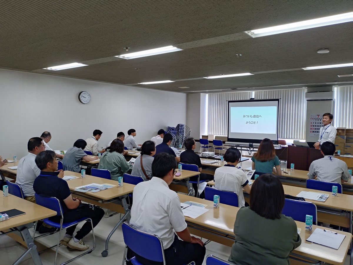 町内の小学校、中学校、高校の教職員22名に参加していただき、当JAでは、私が講師を務め農協の役割、三石農業、JAみついしの業務について説明をさせていただきました。