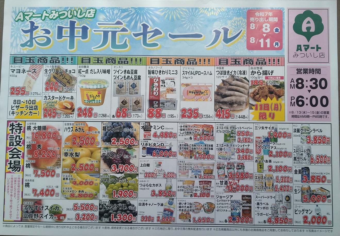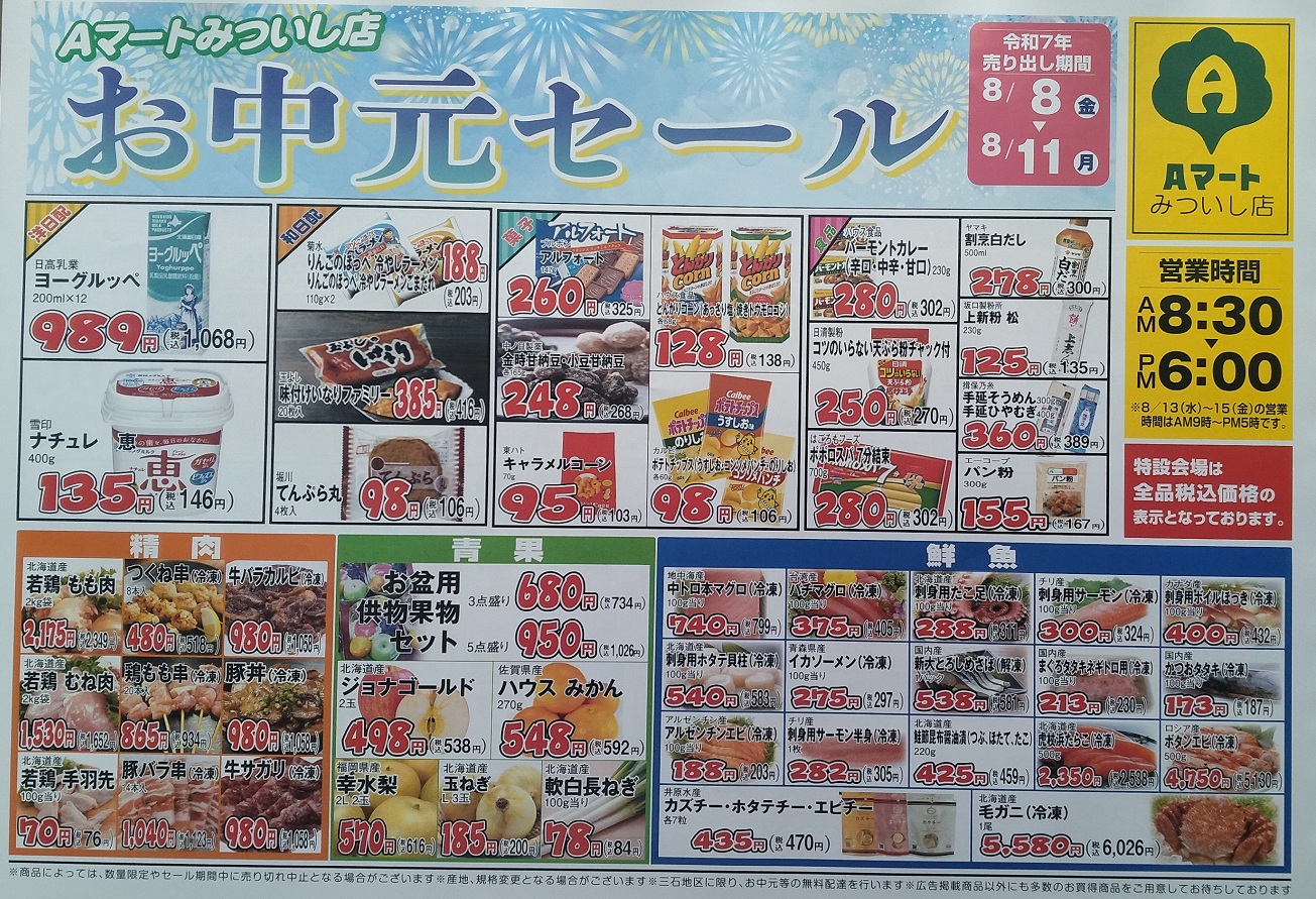 【お知らせ】明日からお中元セール☆ 2025年8月7日 Aマートみついし店にて、明日から【お中元セール】が行われます☆ 8/8~8/11までの4日間となっております。 皆さんのご来店をお待ちしております!