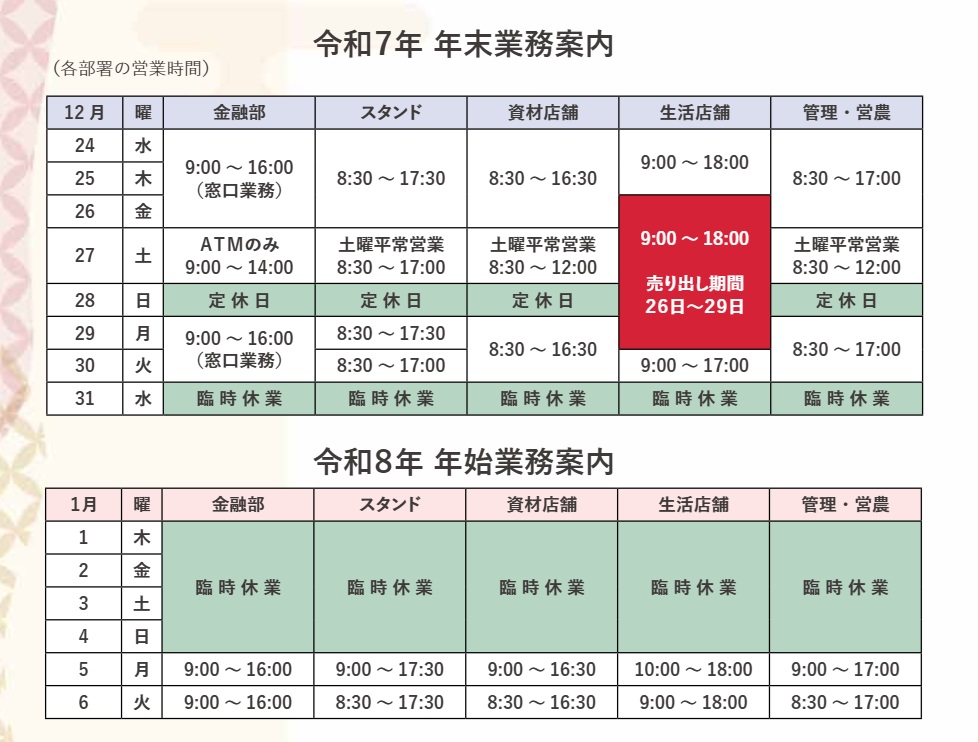 当組合各部の年末年始の業務案内を下記の通りお知らせいたします。