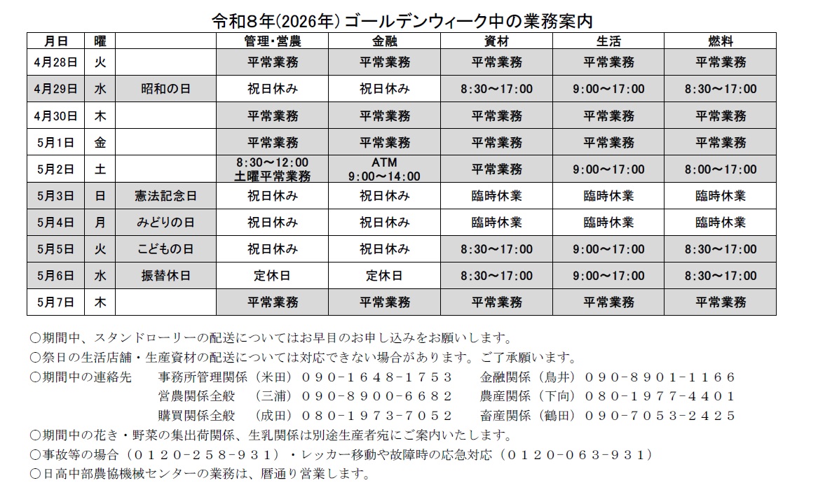 【お知らせ】GW中の業務について 2026年4月25日 平素は格別のお引き立てを賜り、厚くお礼申し上げます。 当組合各部のGW中の業務案内を下記の通りお知らせいたします。 休業の際ご多忙の折、ご不便をおかけすることと存じますが、何卒ご了承くださいますようお願い申し上げます。