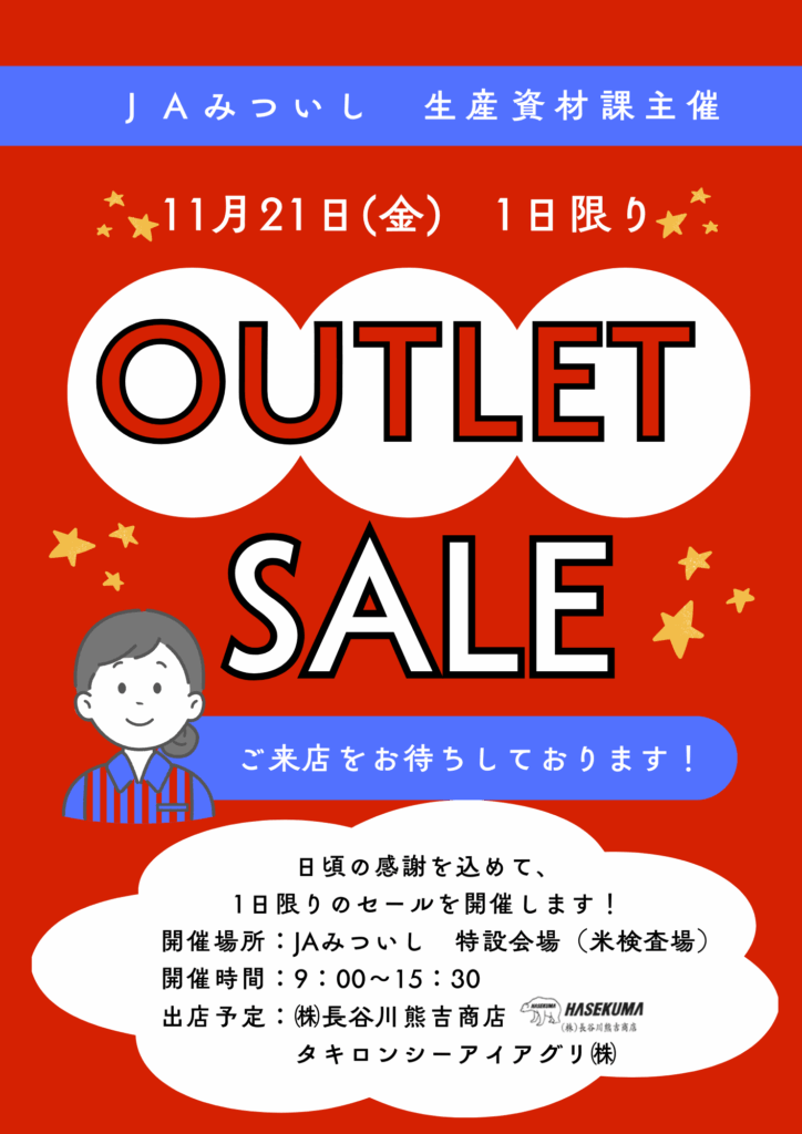 こんにちは!資材課 田村です! みなさんに大事なお知らせです!! 来週21日にJAみついし特設会場(米検査場)にて、年に一度のアウトレットセールを開催します!! こんな掘り出し物が!!こんな便利なものが!! その日限りの […]