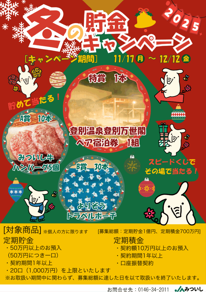 皆さん、こんにちは。 貯金共済課 沢口です! 貯金共済課から大事なお話があります。 本日より、冬の貯金キャンペーンが開始となりました! キャンペーン内容は以下の通りです。 みついし牛ハンバーグの他にもよりぞうトラベルポー […]